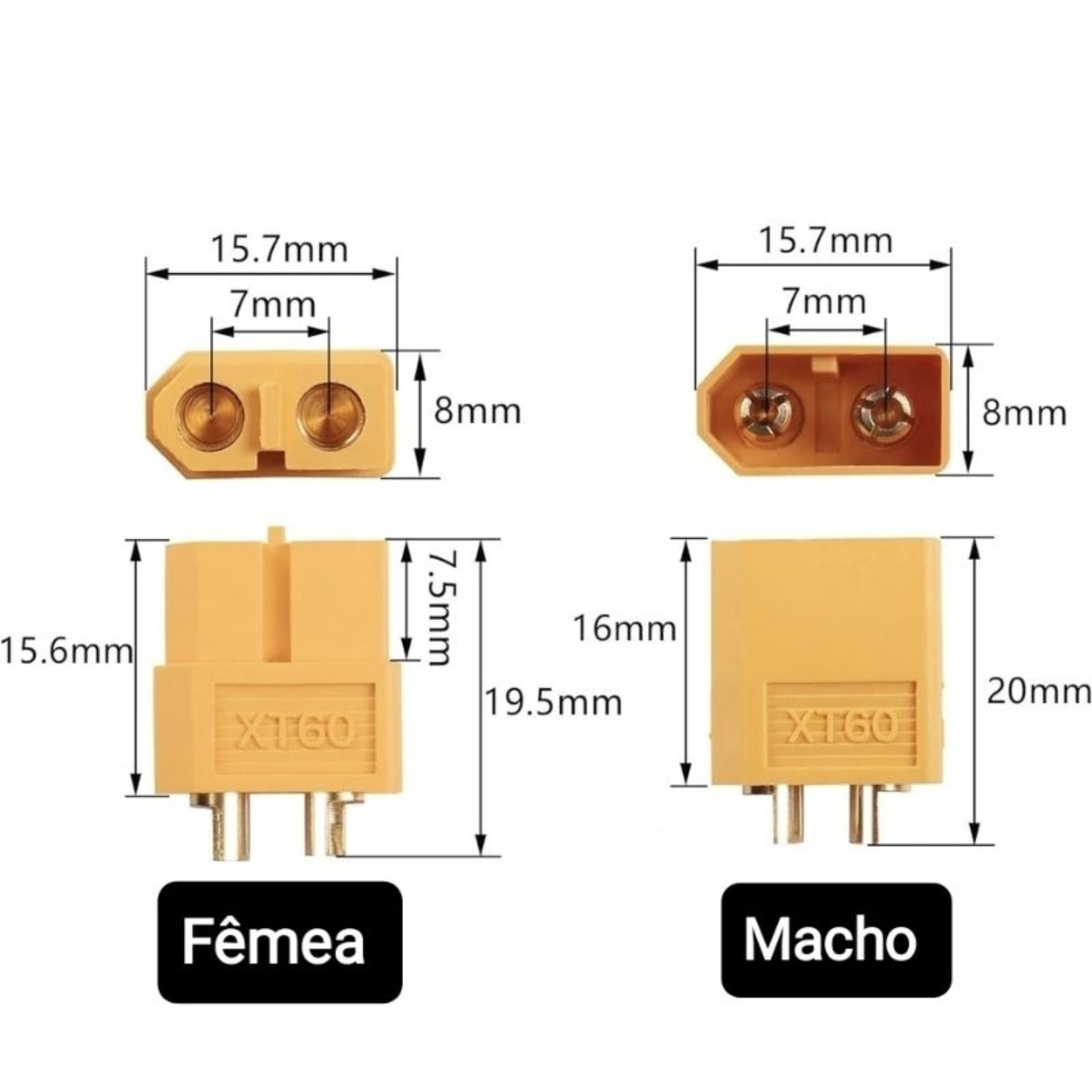 O conector XT60 é amplamente utilizado no aeromodelismo, drones, automodelos e projetos eletrônicos devido à sua alta confiabilidade, segurança e excelente desempenho elétrico. Uma de suas principais qualidades é a capacidade de suportar correntes elevadas de até 60 amperes de forma contínua, garantindo alimentação estável mesmo em sistemas mais exigentes. Fabricado em nylon de alta resistência, o corpo do conector XT60 suporta altas temperaturas, evitando deformações durante a soldagem e aumentando a durabilidade do conjunto. Seus terminais banhados a ouro proporcionam baixa resistência elétrica, melhor condução de corrente e menor aquecimento durante o uso, o que contribui para maior eficiência do sistema.