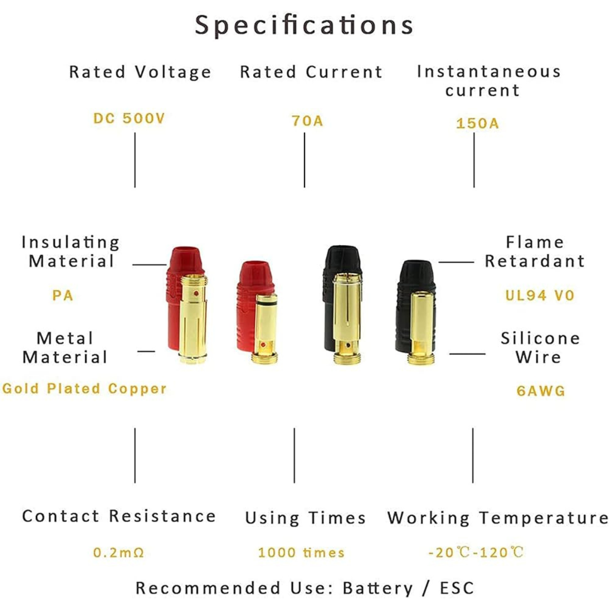 Alta capacidade de corrente Suporta ate 150A de corrente continua sem aquecer ou perder desempenho. Design anti faísca Reduz a formacao de faíscas ao conectar e desconectar, aumentando a seguranca eletrica. Baixa resistencia eletrica Permite conduzir energia com eficiencia, reduzindo perdas e aquecimento. Materiais duraveis Construcao em plastico e contatos de qualidade que oferecem resistencia mecanica e durabilidade no uso.