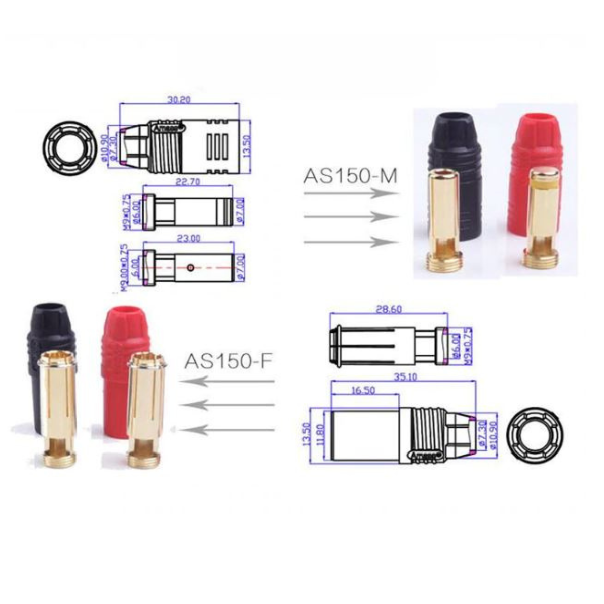 AS150 e um tipo de padrao de conector de alta corrente com pino de 7mm e capacidade de ate 150A.
