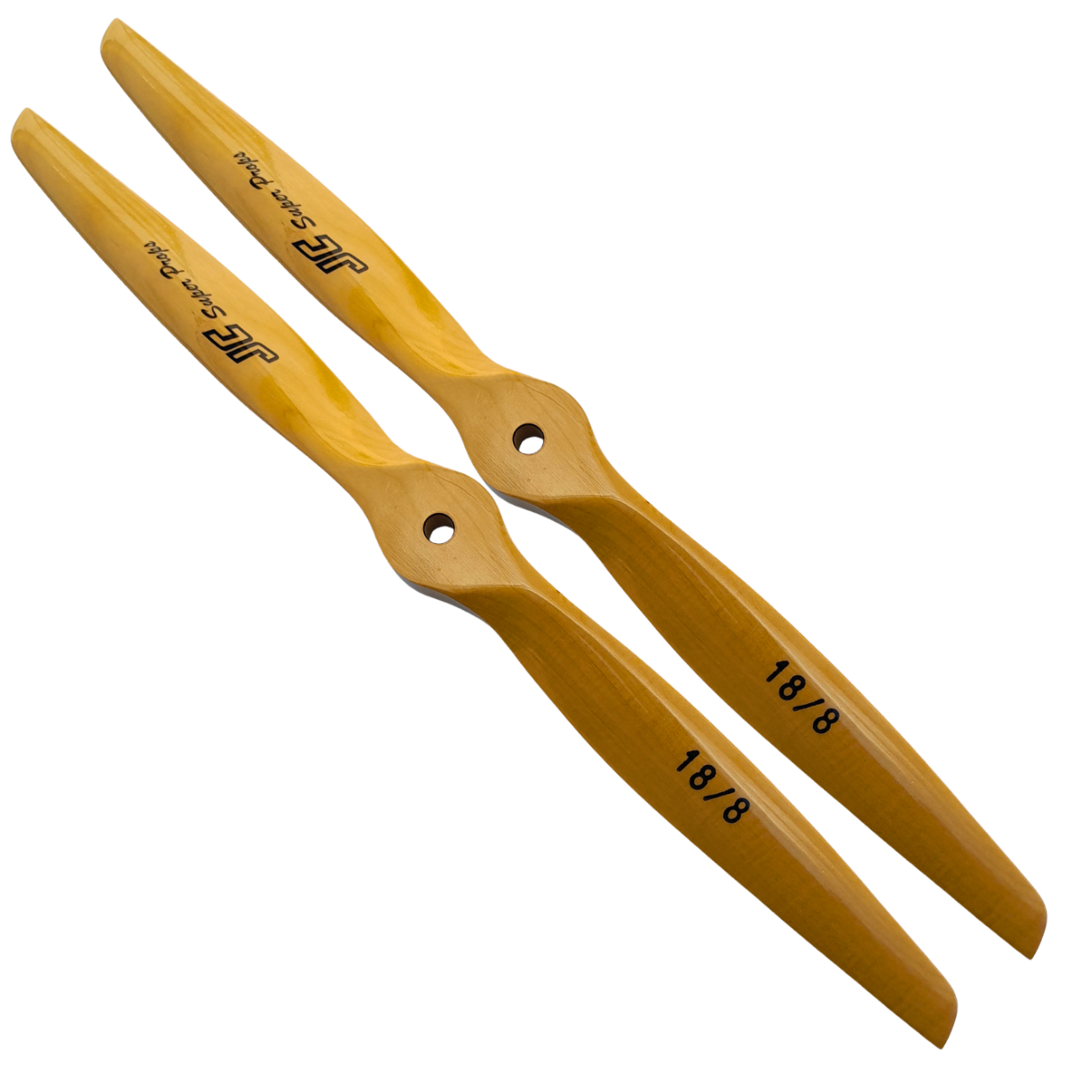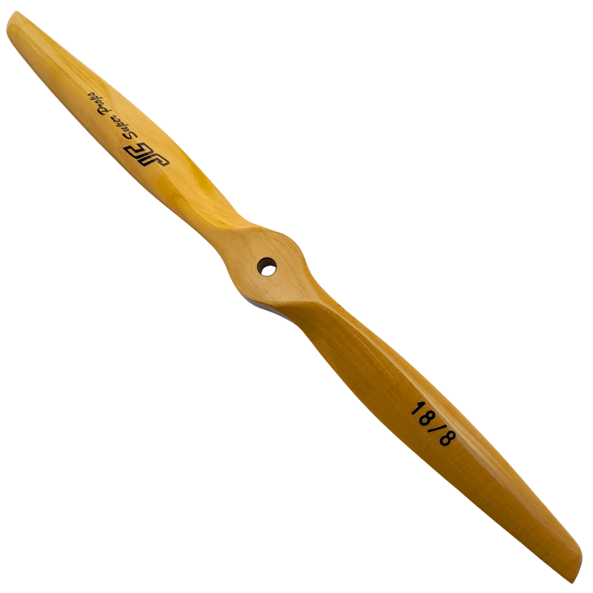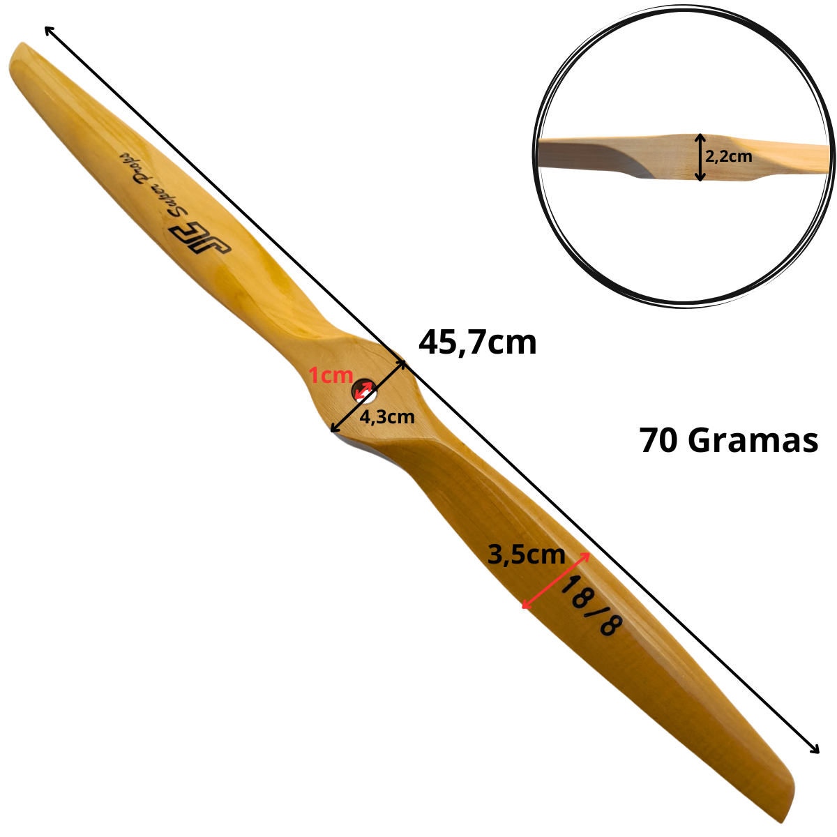 A hélice 18×8 da JC Super Props é feita em madeira de alta densidade escolhida criteriosamente, o que proporciona uma peça robusta e ao mesmo tempo leve, reduzindo vibrações. A madeira utilizada pela JC fica estocada por vários meses para secar, garantindo maior estabilidade e evitando empenamentos. Cada hélice é usinada com precisão por máquinas CNC e depois recebe acabamento manual, resultando num perfil aerodinâmico eficiente e um acabamento de alta qualidade. A hélice passa por testes de torção e ruptura e é balanceada individualmente, o que garante funcionamento suave e seguro mesmo em rotações mais altas. Ela recebe 3 camadas de selador impermeável para proteger a madeira contra umidade, além de 2 camadas de verniz para aumentar a resistência a óleo e combustível.